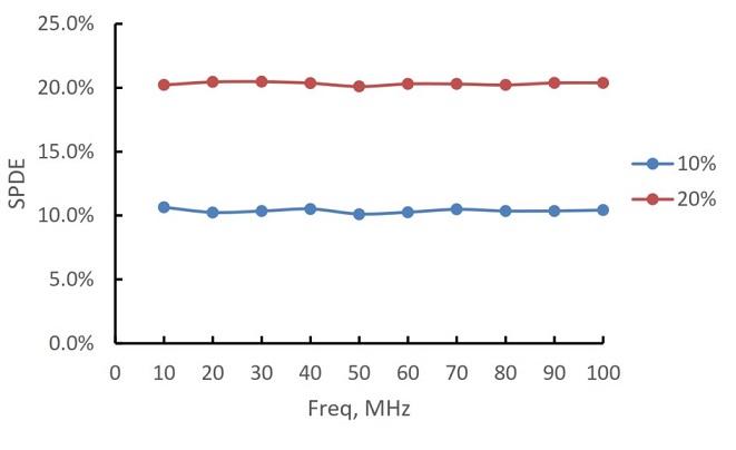 Active Gate Width (Gate width = 1ns)SPDE vs Gate Frequency (SPDE=10%, 20% @1550nm)