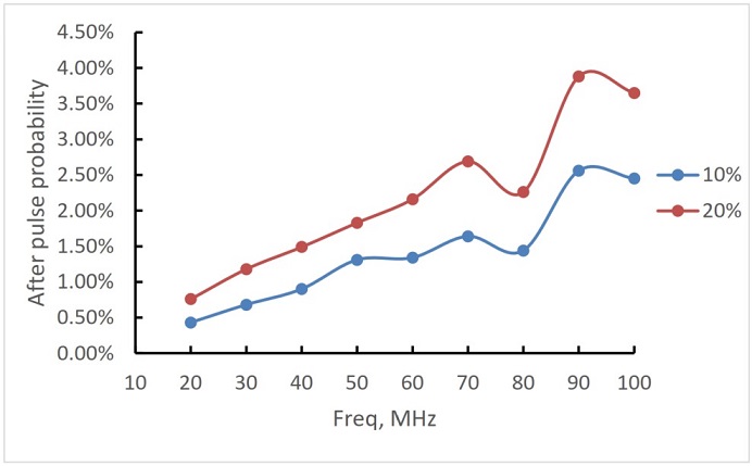 After Pulse Probability vs Gate Frequency (SPDE=10%, 20% @1550nm)