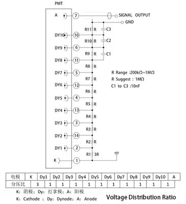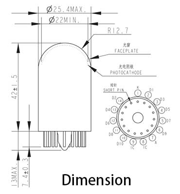 Spectral range:300-650nm;Photocathode Luminous Sensitivity:Min 25μA/lm(Typ:50μA/lm); Anode Luminous Sensitivity:Min 200A/lm(Typ:500A/lm); Gain:1*10^7; Dark current:Typ:3nA(Max:7nA)