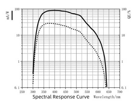 Spectral Range:290-650 nm ; Peak QE:420 nm ;Blue Sensitivity:Min :10/Typ:11.5μA/lmf;Gain:Typ:2.73*10^5 ; Dark Current :Typ:2/Max:30nA