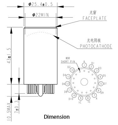 Spectral range:300-650nm;Photocathode Luminous Sensitivity:Min 25μA/lm(Typ:50μA/lm); Anode Luminous Sensitivity:Min 200A/lm(Typ:500A/lm); Gain:1*10^7; Dark current:Typ:3nA(Max:7nA)