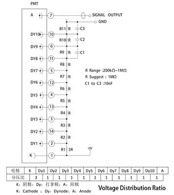 Spectral range:300-650nm;Photocathode Luminous Sensitivity:Min 25μA/lm(Typ:50μA/lm); Anode Luminous Sensitivity:Min 200A/lm(Typ:500A/lm); Gain:1*10^7; Dark current:Typ:3nA(Max:7nA)