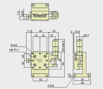 13mm Crossed Roller Guide Z-axis Vertical Stage, Right Side Drive, Platform dimensions=40x40mm