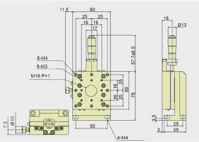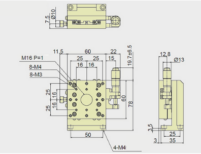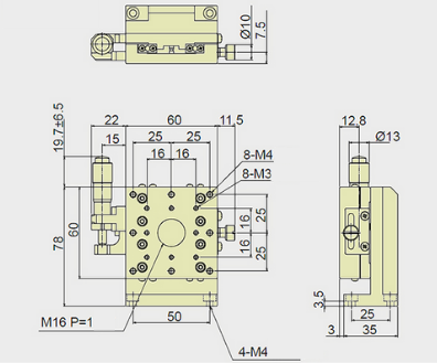 13mm Z-axis Vertical Stage, Right Side Drive, Platform dimensions=60x60mm