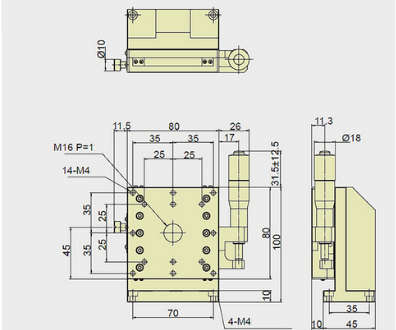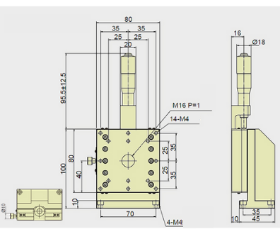 25mm Crossed Roller Guide Z-axis Vertical Stage, Right Side Drive, Platform dimensions=80x80mm