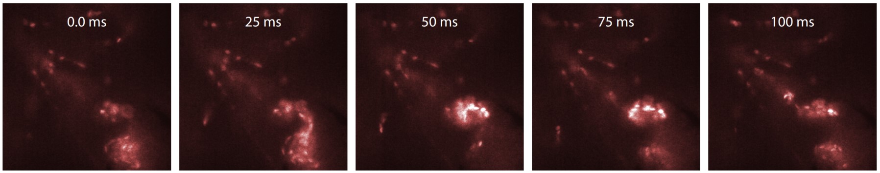Frames from a 2000 fps recording of the heart of a zebrafish. On average, the heart of a zebrafish beats 2 to 3 times a second. By labelling the blood cells with a DS_red fluorescent dye, detailed images of the various stages of one heartbeat can be recorded.