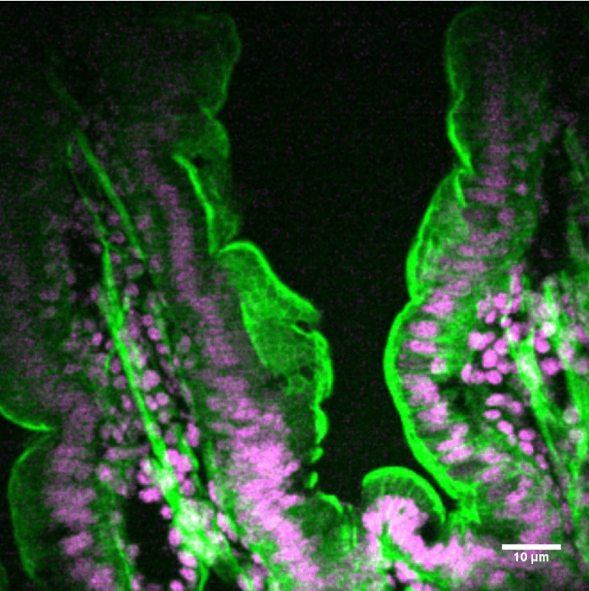 Two-Photon Fluorescence Microscopy Image of a Mouse Intestine. Section stained with