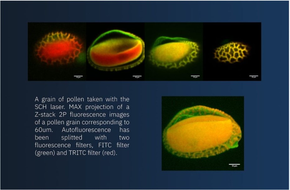An image of a pollen grain using the pollen autofluorescence excited by the Cyclone laser shows the great image quality and simultaneous excitation at different spectral channels.
