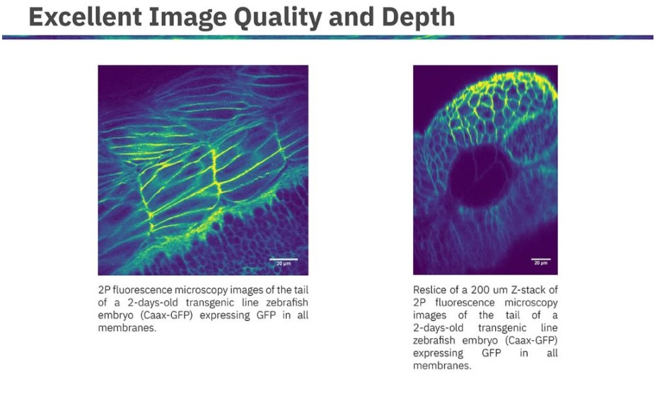 The red-shifted NIR wavelengths of Cyclone laser combined with the increased excitation efficiency leads to better image brightness and deeper penetration. A 200 microns deep sample of a zebra fish is simply imaged by the Cyclone laser.