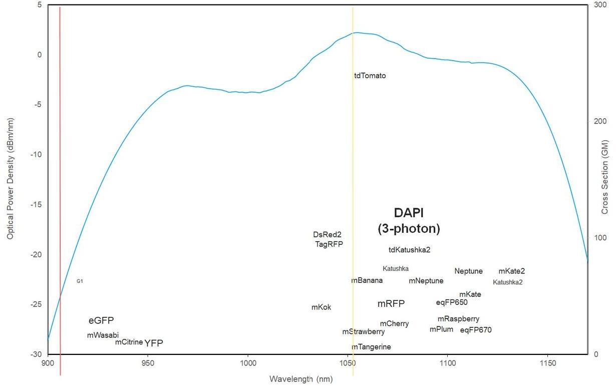 Cyclone provides an extremely wide spectral bandwidth which expands in the NIR across the 900-1200nm spectrum. This overlaps with the two-photon excitation spectra of most green and red-shifted fluorescent labels, including eGFP, mRFP and DsRED. This remarkably exceeds the range of fluorescent labels that can be simultaneously excited with conventional femtosecond lasers, including broadly tunable lasers and single-line femtosecond fiber lasers.