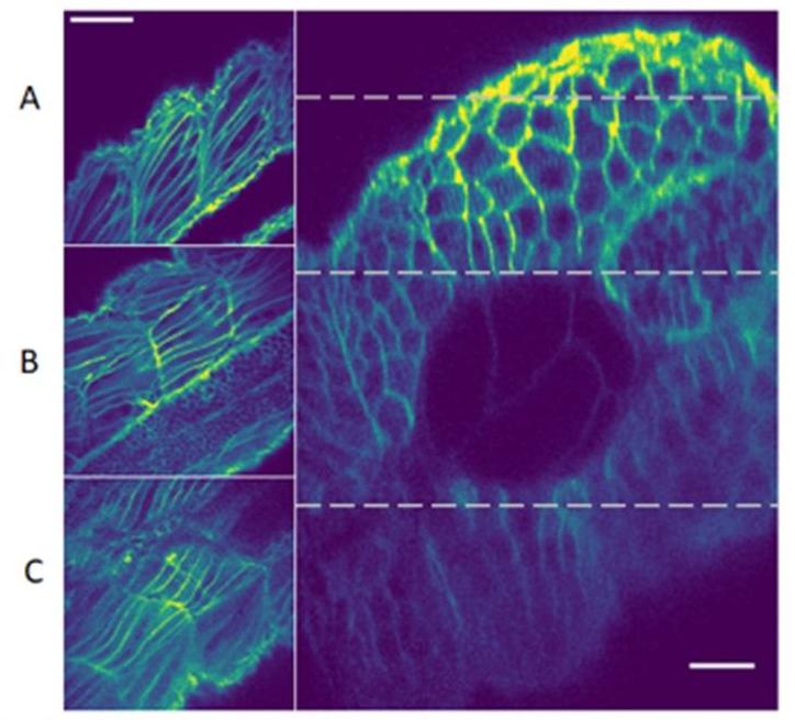 Figure 3: TPEF images of the tail of a 2-days-old transgenic line zebrafish embryo (Caax-GFP) expressing GFP in all cell membranes. (A-C) Intensity-normalised images corresponding to 26, 71, 150 µm depth. (D) the complete resliced image of a Z-stack composed of 300 images (0.71 µm step spacing). Scalebar: (A-C) 40 µm; (D) 20 µm.