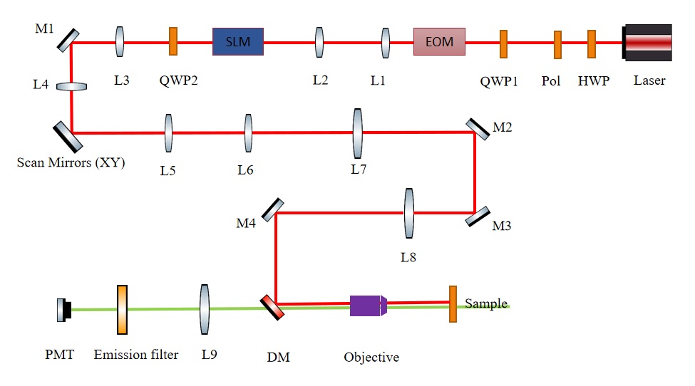 In two-photon microscope, a laser emits light at a specific wavelength that is absorbed by the fluorescent molecules in the sample. When two photons of this light are absorbed simultaneously, they provide enough energy to excite the fluorescent molecule and cause it to emit light at a longer wavelength, which can be detected by the microscope. Because two photons are required to excite the molecule, the probability of fluorescence emission is low and only occurs at the focal point of the microscope, allowing for high-resolution imaging and greater depth than conventional microscopes.