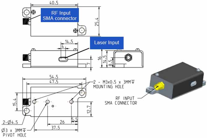 Free-space Acousto-Optic Modulators (AOM), Wavelength 380-600 nm, Active Aperture 3×1 mm, Center Frequency 250 MHz, 3dB Bandwidth ±20MHz, Diffraction Efficiency >75%, Transmission >95%, Tellurium dioxide, Conduction Cooling, Optional RF driver