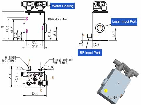 Free-space Acousto-Optic Modulators (AOM), Wavelength 355 nm, Active Aperture 6.0 mm, Center Frequency 170 MHz, Diffraction Efficiency >85%, Transmission >93%, Crystalline Quartz, Water Cooling, Optional RF driver