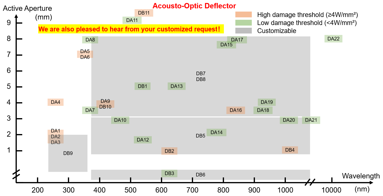 Wavelength 266-355nm, Clear Aperture 0.2-2mm, Center Frequency 200-400MHz, 3dB Bandwidth 100-200MHz, Diffraction Efficiency >60%, Optional RF Driver
