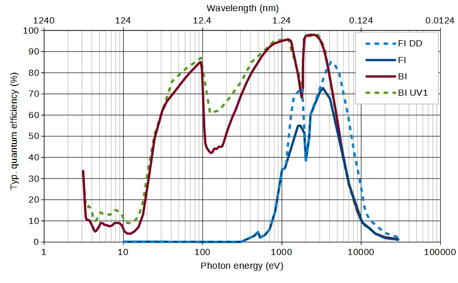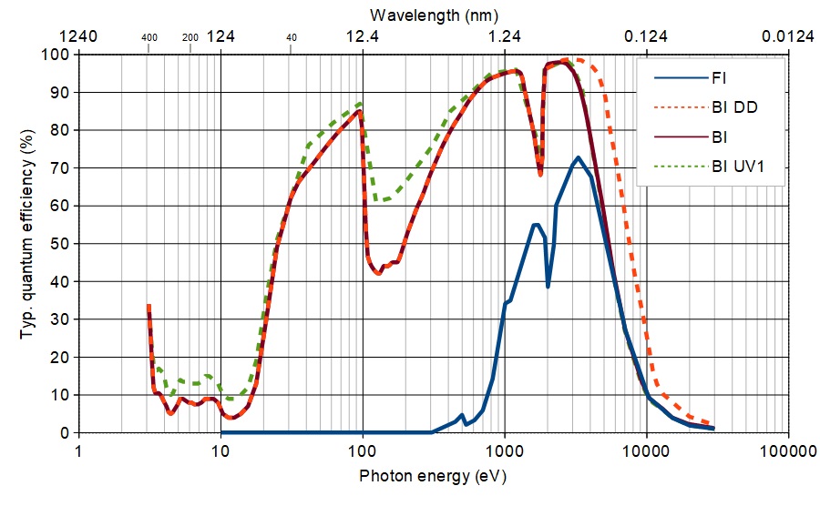 Scientific Full-Frame CCD Cameras for VUV EUV X-ray for Imaging , Image Area 13.3 mm × 13.3 mm, Pixel Format 1056 × 1027 Pixels, Pixel Size 13 µm × 13 µm, Gain 1 Counts/e-, CCD Sensor Type Back-illuminated, Enhanced Process, Full Well Capacity 100 k e-,Up to 96% Quantum Efficiency, VUV to X-ray Range