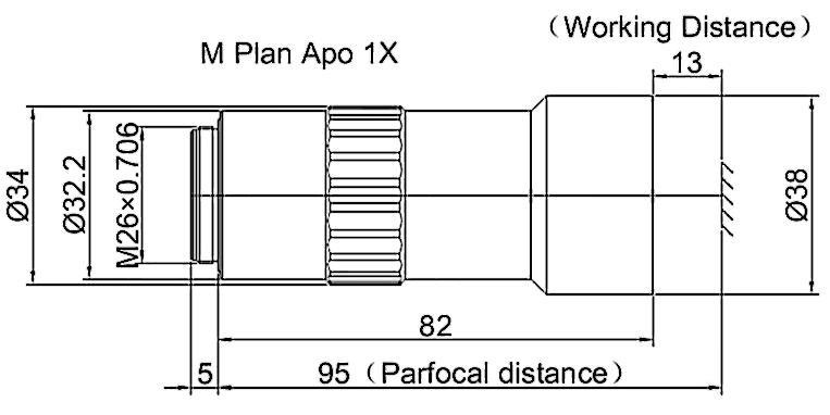 Plan Apochromatic Objective(VIS) 1X, Numerical Aperture 0.025, Working Distance 13MM, Focal Length 200MM, Resolution 11.0um, Depth of Focus 440um