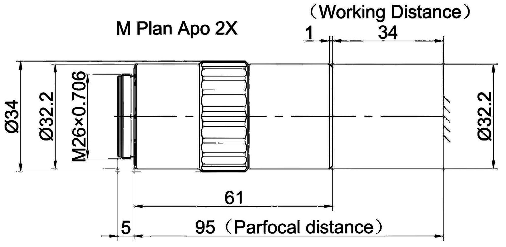 Plan Apochromatic Objective(VIS) 2X, Numerical Aperture 0.055, Working Distance 34MM, Focal Length 100MM, Resolution 5.0um, Depth of Focus 91um