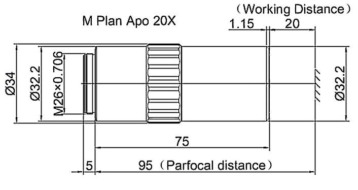 Plan Apochromatic Objective(VIS) 20X, Numerical Aperture 0.42, Working Distance 20MM, Focal Length 10MM, Resolution 0.7um, Depth of Focus 1.6um