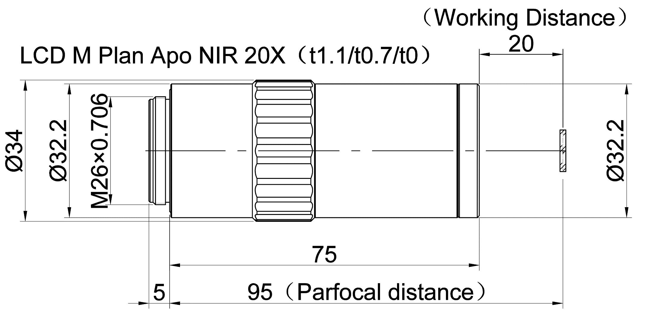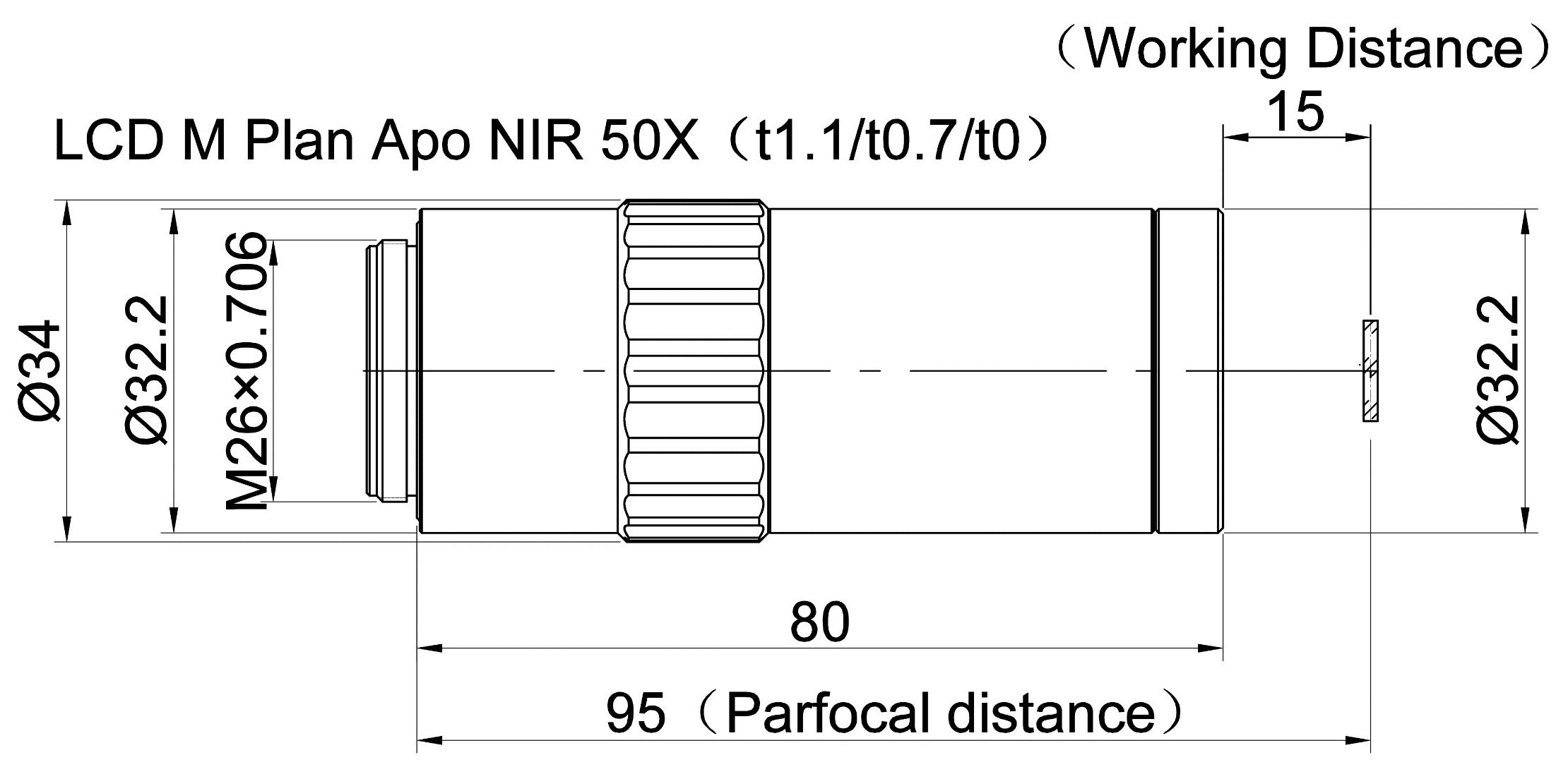 LCD Plan Apo NIR(Liquid Crystal Display Plan Apochromatic objective NIR) is long working distance objective with an infinite conjugate parfocal distance of 95mm. The thickness of the corresponding cover glass is t=0, t=0.7, t=1.1, which can be achieved by replacing the corresponding protective lens holder. This objective can be used for 532nm,1030~1064nm laser processing.