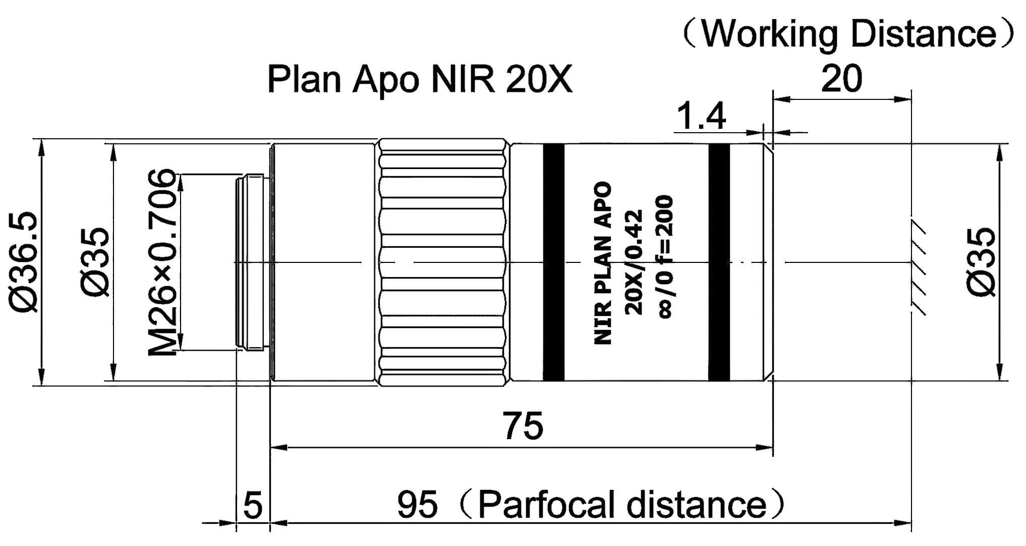 Plan Apochromatic Objective NIR 20X, Numerical Aperture 0.42, Working Distance 20MM, Focal Length 10MM, Resolution 0.65um, Depth of Focus 1.56um