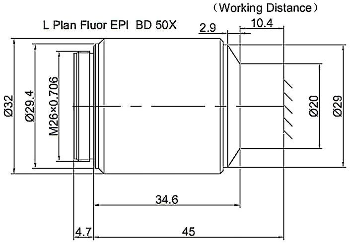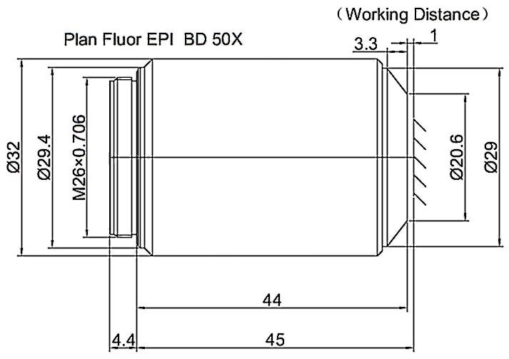 Long Working Distance Plan Fluorite Objective Episcopic Coaxial Illumination Bright and Dark Field 50X, Optical System Characteristics Infinite Correction, Observation Method Bright Field / Dark Field, Level of Chromatic Aberration Correction Semi-apochromatism, Focal Length 4MM, Numerical Aperture 0.5, Working Distance 10.4MM, Field Number of The Objective 25MM, Resolution 0.55um, Depth of Focus 1.1um