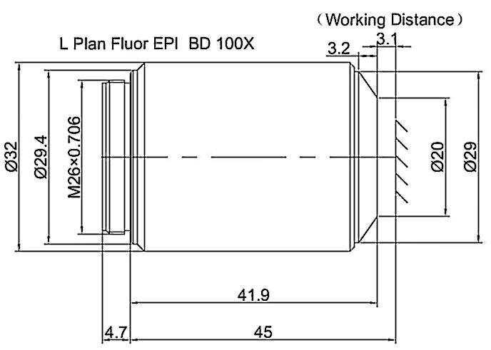 Long Working Distance Plan Fluorite Objective Episcopic Coaxial Illumination Bright and Dark Field 100X, Optical System Characteristics Infinite Correction, Observation Method Bright Field / Dark Field, Level of Chromatic Aberration Correction Semi-apochromatism, Focal Length 2MM, Numerical Aperture 0.8, Working Distance 3.1MM, Field Number of The Objective 25MM, Resolution 0.34um, Depth of Focus 0.43um