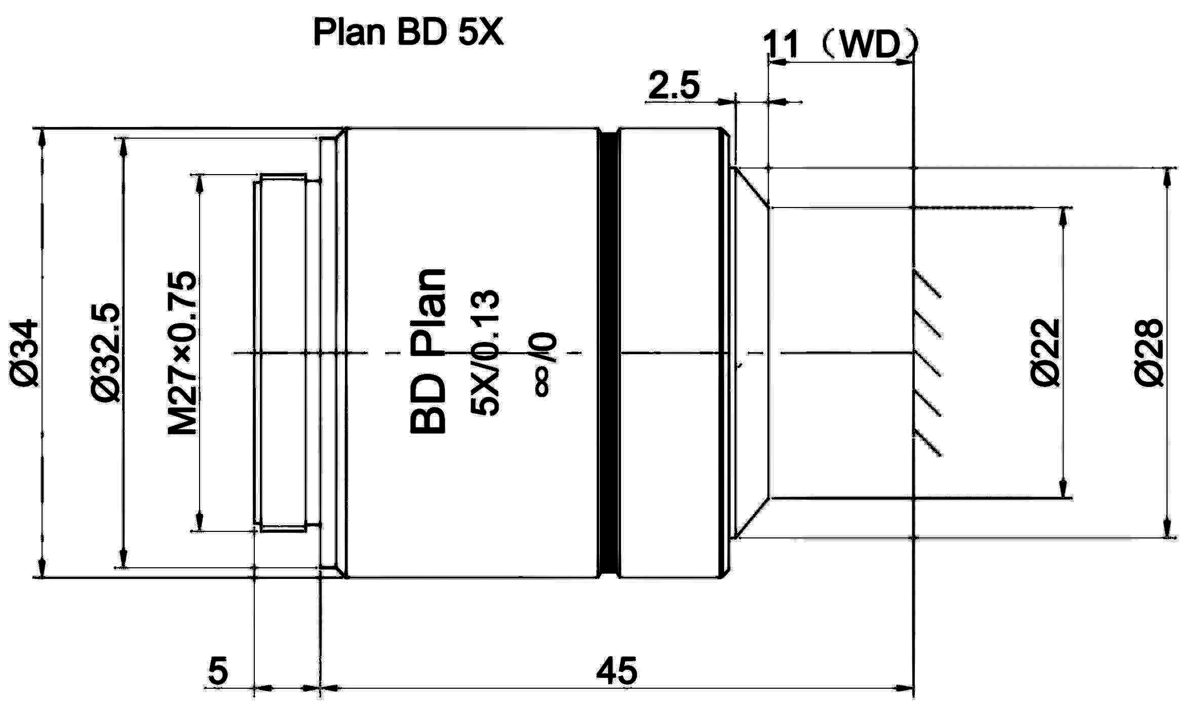 Plan Objective Bright and Dark Field 5X, Optical System Characteristics Infinite Correction, Observation Method Bright Field / Dark Field, Level of Chromatic Aberration Correction Achromatism, Focal Length 40MM, Numerical Aperture 0.13, Working Distance 11MM, Field Number of The Objective 25MM, Resolution 2.1um, Depth of Focus 16.3um