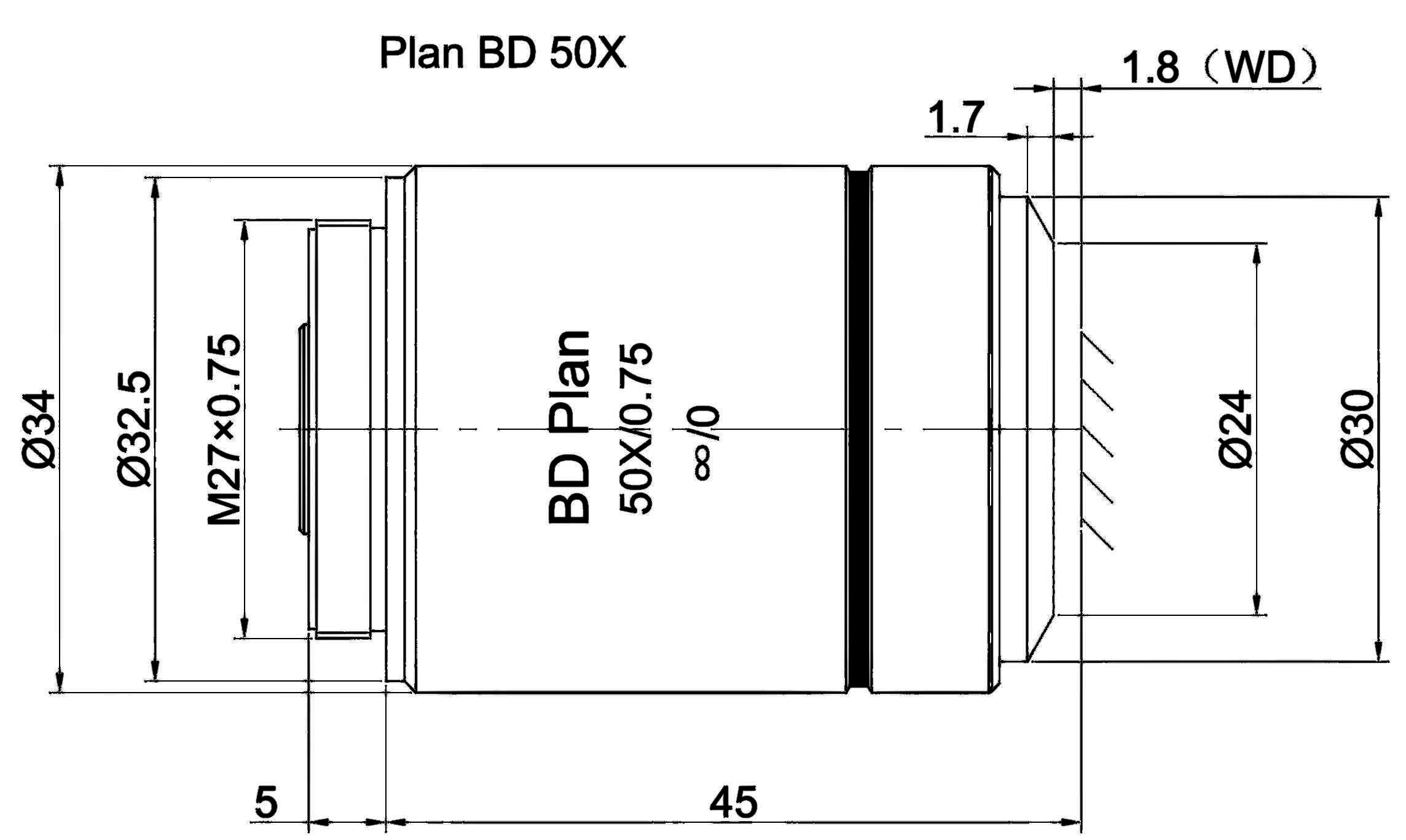 Plan Objective Bright and Dark Field 50X, Optical System Characteristics Infinite Correction, Observation Method Bright Field / Dark Field, Level of Chromatic Aberration Correction Achromatism, Focal Length 4MM, Numerical Aperture 0.75, Working Distance 1.8MM, Field Number of The Objective 25MM, Resolution 0.37um, Depth of Focus 0.49um