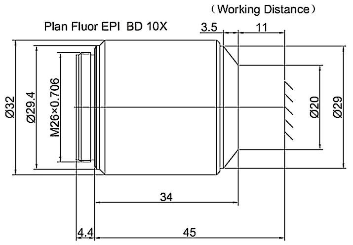 Plan Fluorite Objective Episcopic Coaxial Illumination Bright and Dark Field 10X, Optical System Characteristics Infinite Correction, Observation Method Bright Field / Dark Field, Level of Chromatic Aberration Correction Semi-apochromatism, Focal Length 20MM, Numerical Aperture 0.3, Working Distance 11MM, Field Number of The Objective 25MM, Resolution 0.9um, Depth of Focus 3.1um