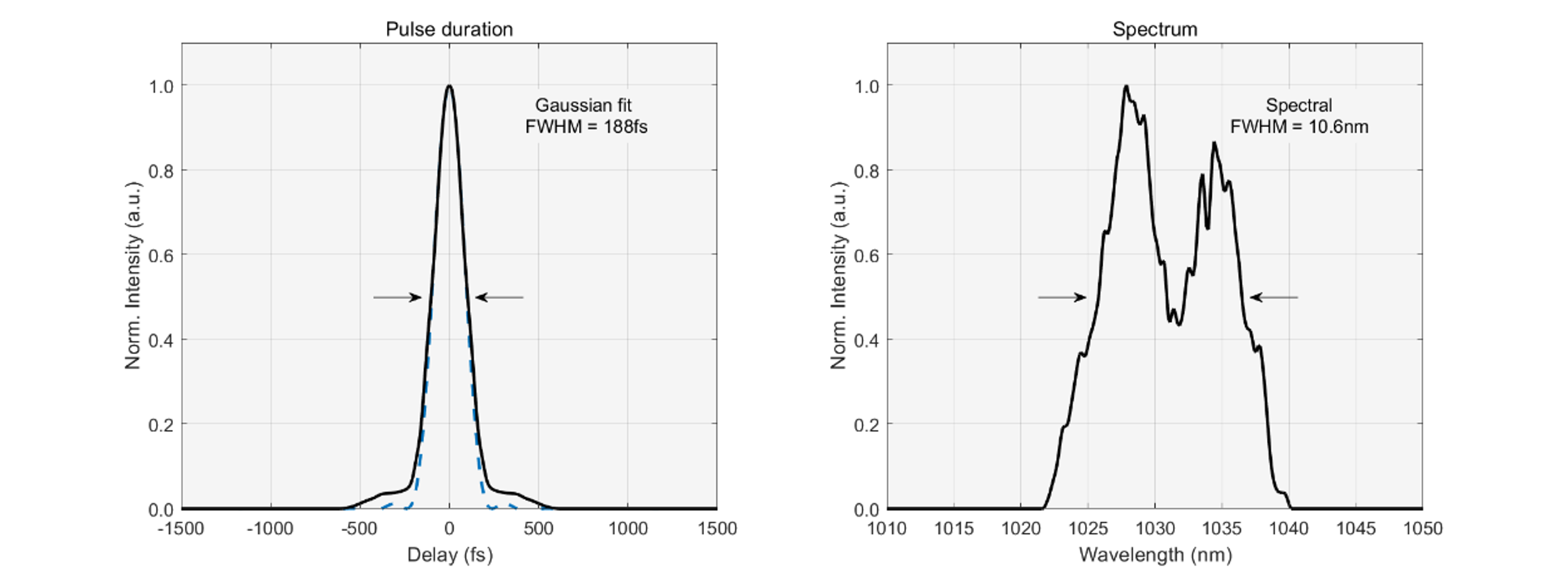 The STHO series of femtosecond solid-state lasers boast excellent pulse quality. The left image shows the output pulse curve of the STHO-10W-HE series. The blue dashed line represents the Fourier Transform Limited pulse (FTL) from the spectrum on the right, indicating the optimal pulse width achievable by this laser. The black solid line is the actual measured autocorrelation curve, showing that at 1mJ energy output, the pulse width is very close to the FTL, with noise floor intensity less than 3% of the peak value, and the overall pulse intensity has a very small energy distribution beyond ±500fs.