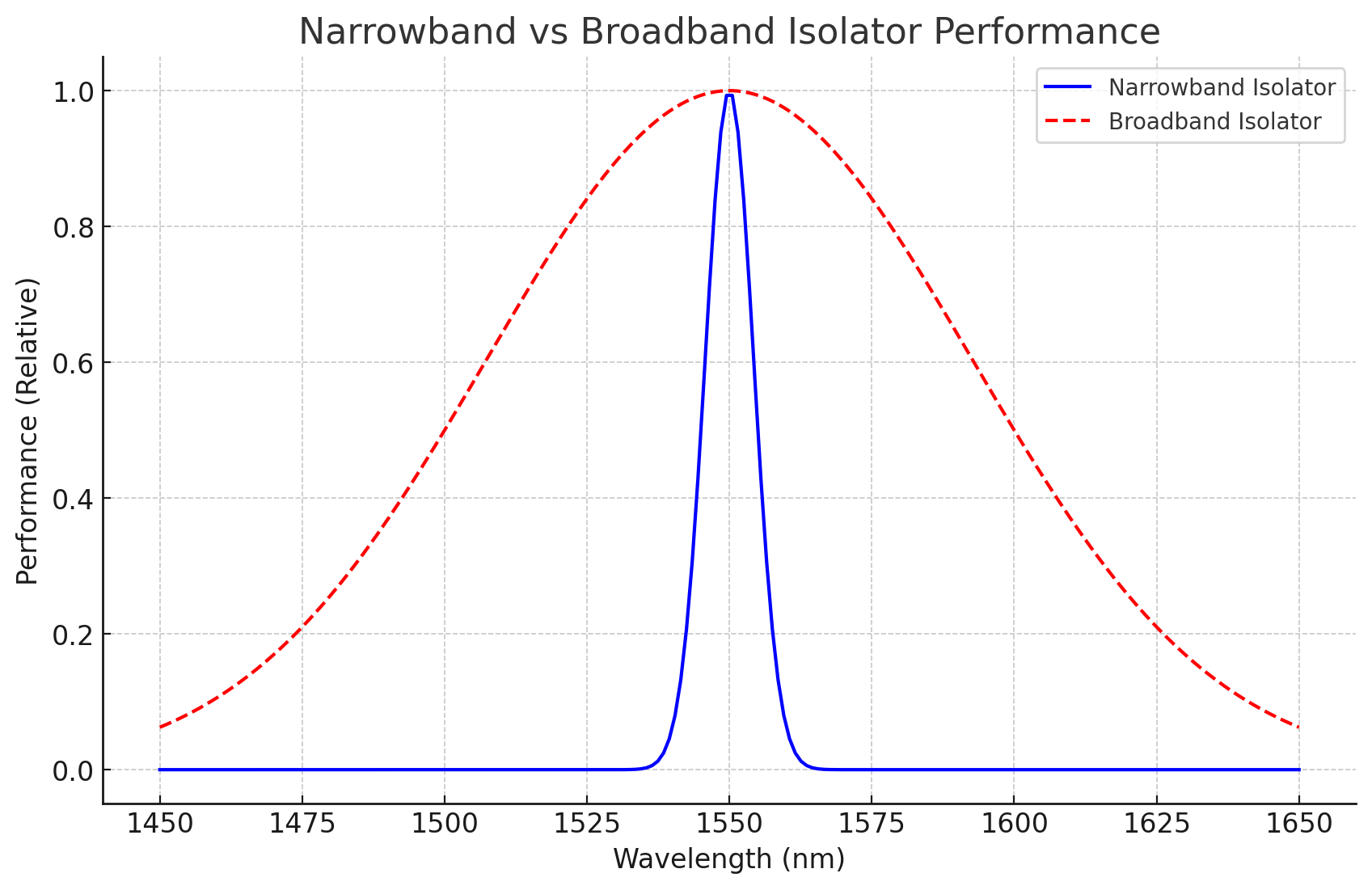 When choosing between a narrowband and a broadband isolator, one must consider the specific application requirements, including the necessary wavelength range, performance expectations, and system design.
