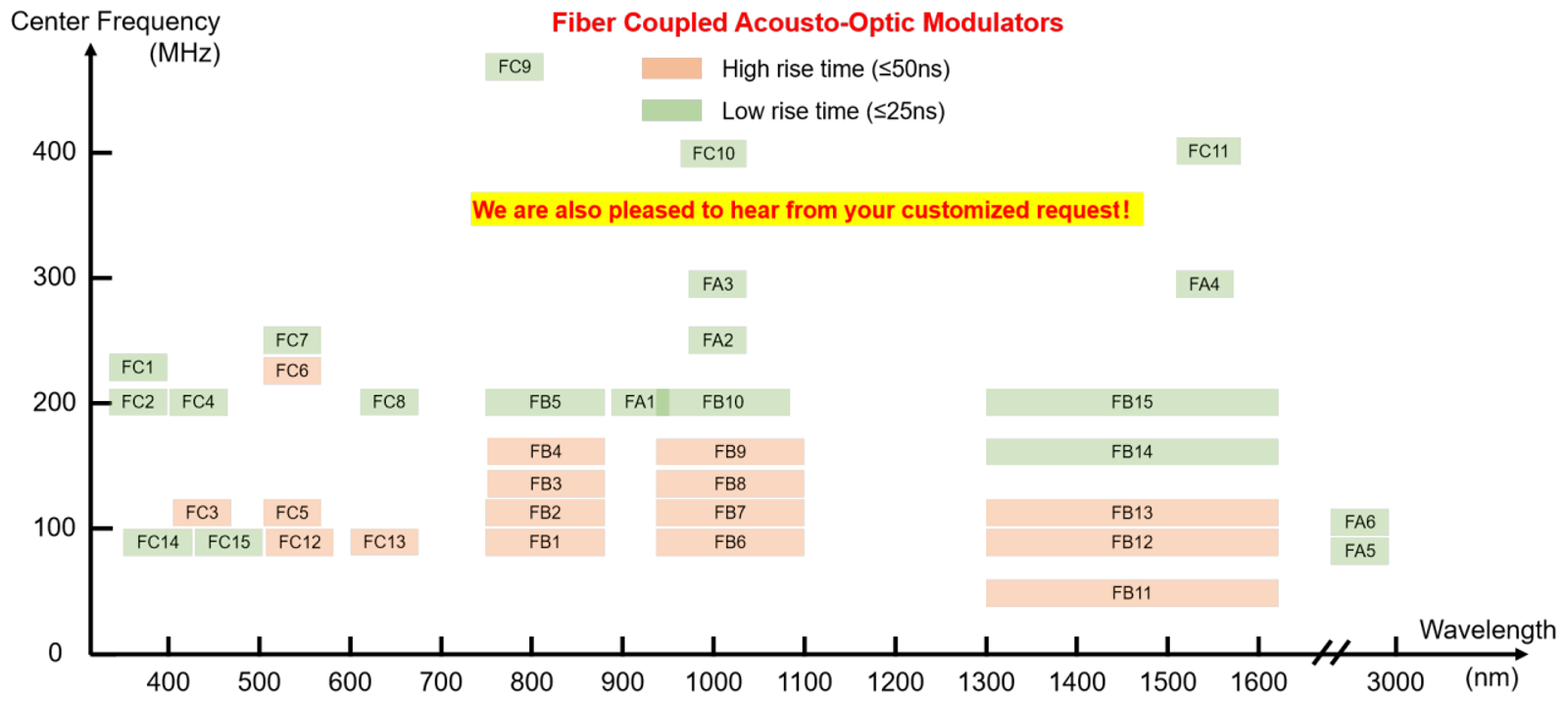 Fiber Coupled Acousto-Optic Modulators (AOM), Wavelength 1310, 1550, 1620-1680 nm, Operating Frequency 100 MHz, Fiber Type SMF-28e/PM1550, Rise time ≤30 ns, Insertion Loss <2.5dB, Optional RF driver