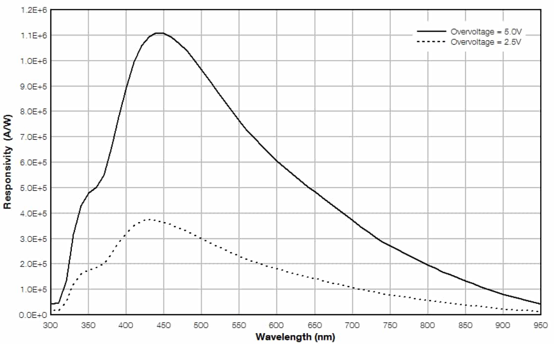 Spectral range:300-950nm;peak wavelength:420nm;dark voltage:2mV;active area:1*1mm;microcell size:35μm; PDE:41%;No. of microcells:504;Gain:3*10^6