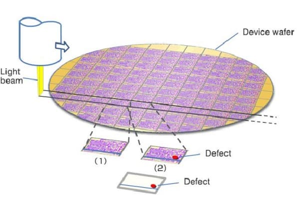 The wafer defect detection system identifies physical and pattern defects on wafers, providing their location coordinates (X, Y). Line-scan confocal technology speeds up detection time by more than 10 times.