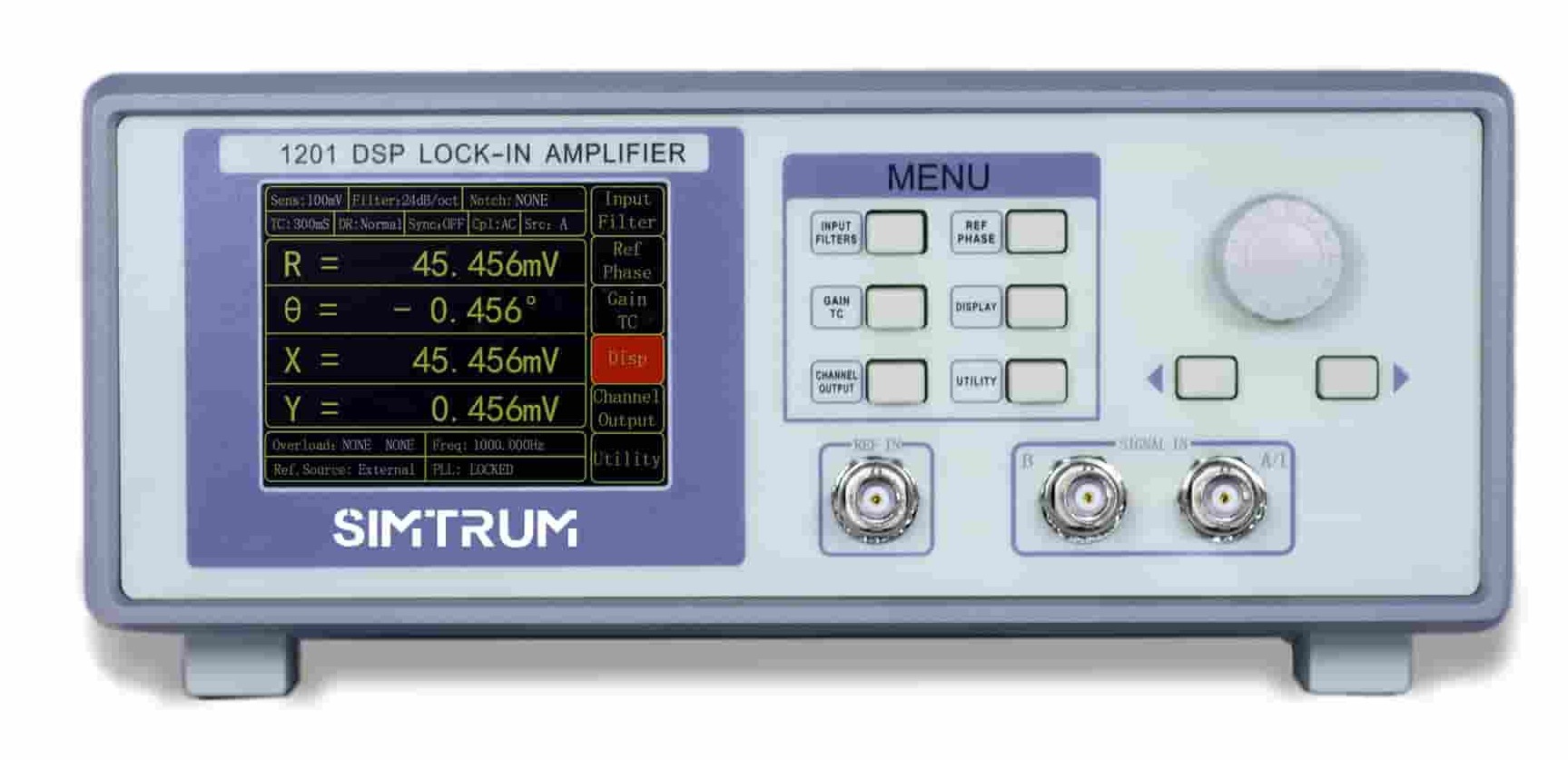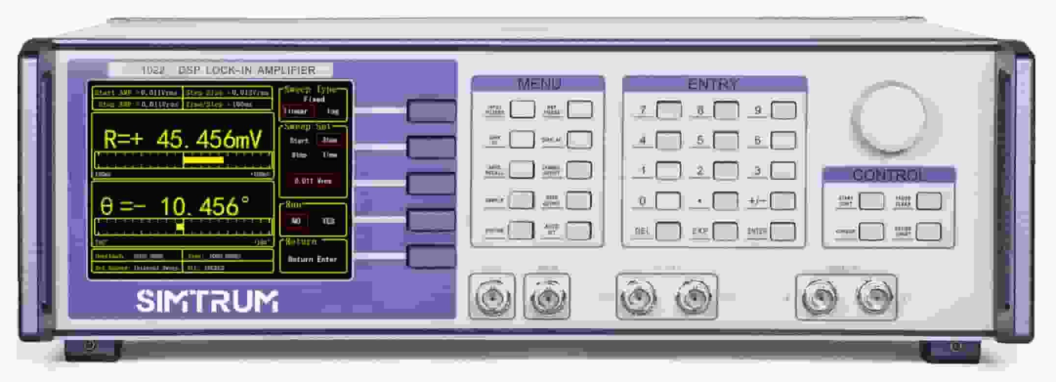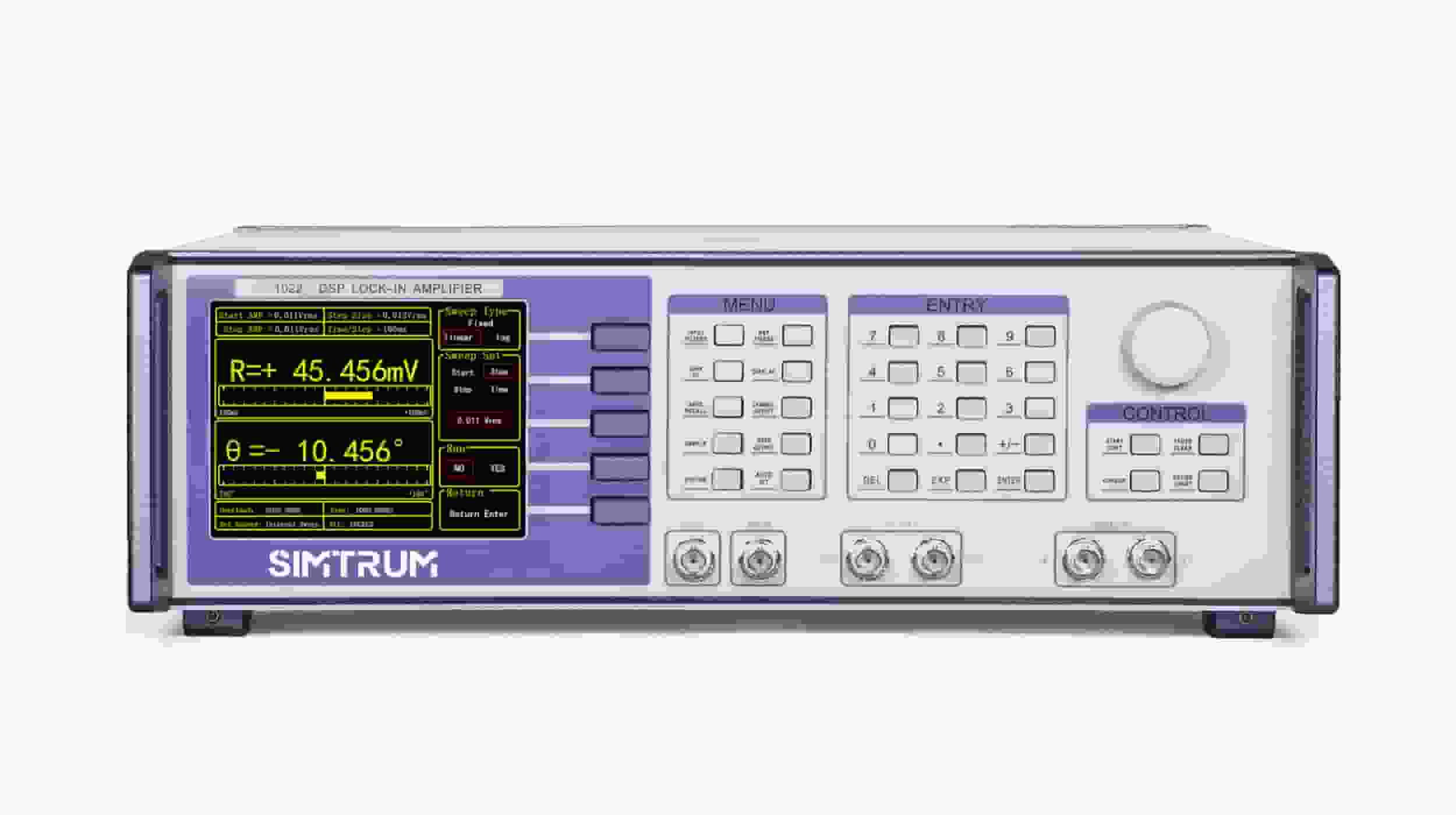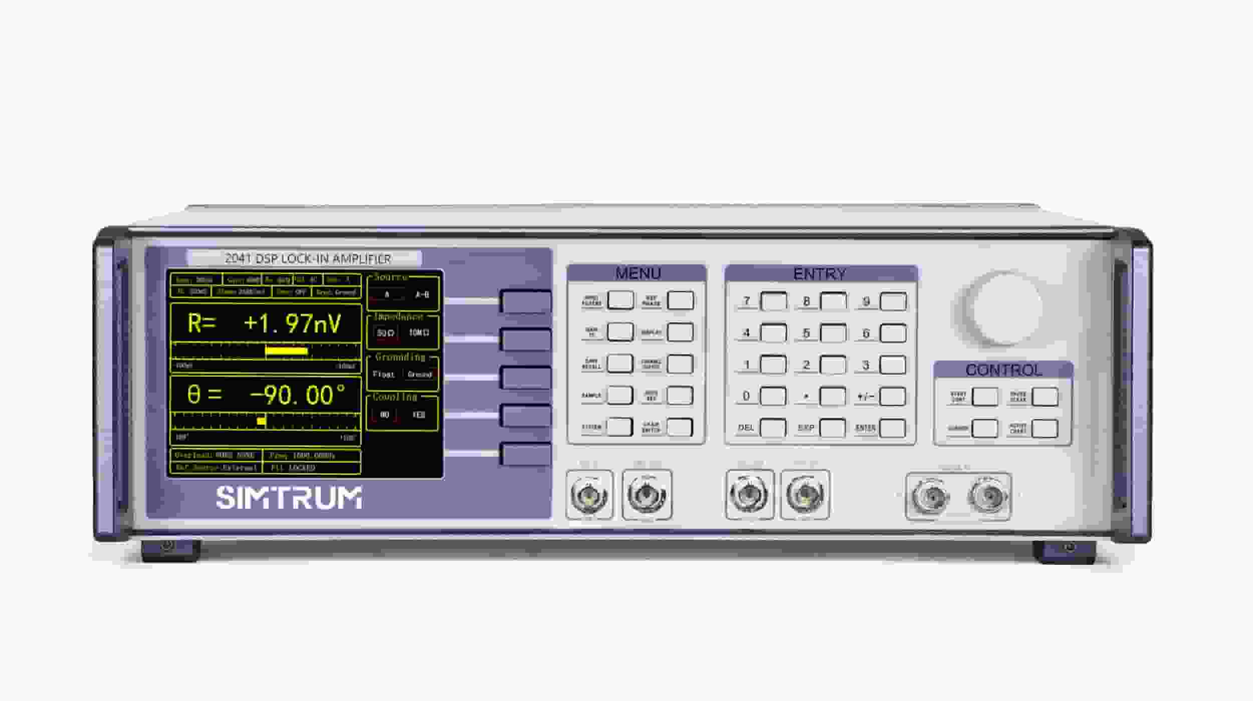 SIMTRUM'S Single-channel Lock-in Amplifier detects an input signal in a single-ended mode or a differential voltage mode. With an ultra low-noise pre-amplifier, the input noise is low. Besides, the device can be used for current measurement with gains of 106 or 108 V/A. Two line filters (50/60 Hz and 100/120 Hz) are designed to eliminate power frequency interference. A programmable gain amplifier is used to adjust the dynamic reserve of the system, so that LIA can keep a high dynamic reserve.