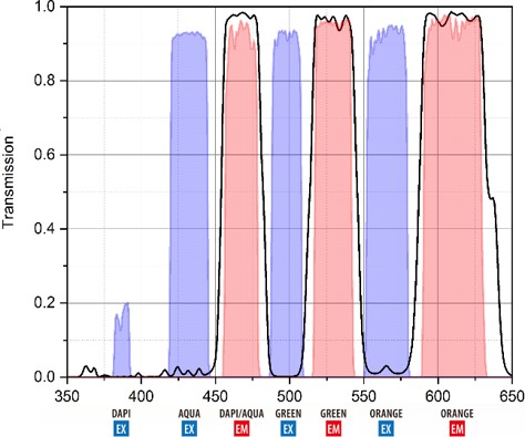 69014 ET Series FISH Multi-band Filter Sets,FISH Probe DAPI/Aqua/Green/Orange,Filters can be purchased separately
