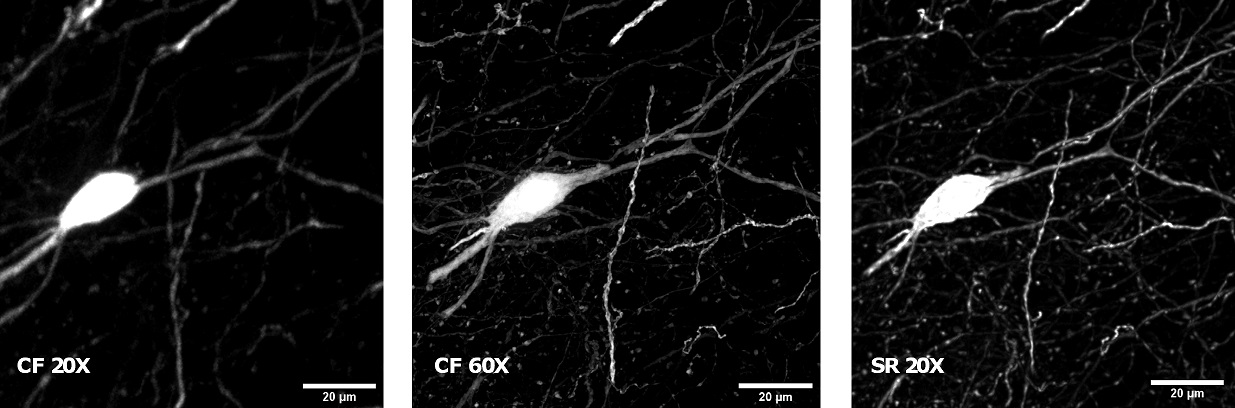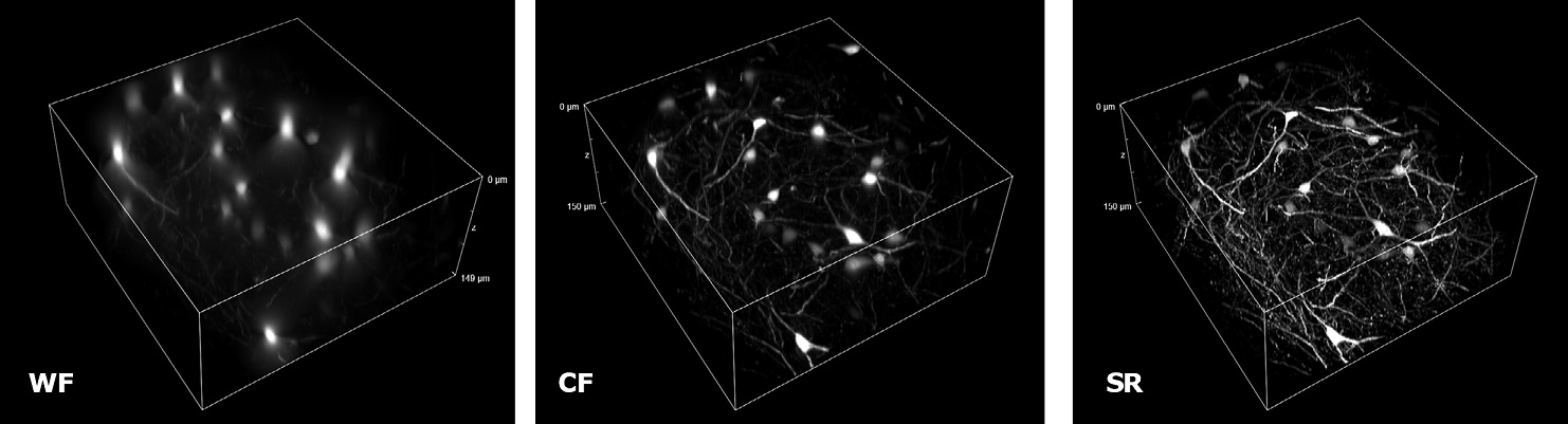 Figure 2: Cleared mouse brain section with GFP-expressing neurons. (A) Comparison of WF, CF spinning disk and SIM Basic SR acquisition acquired with 20X air objective and shown as maximum intensity projection from Z stack; (B) 3D volume views acquired with 20X air objective, 150 um thickness. (C) Comparison between 3D volume views acquired with SIM Basic SR module equipped with 20X air objective (left) and CF spinning disk equipped with 60X oil objective (right). (D) Focus on neuronal details and comparison between three different acquisition modalities: CF spinning disk equipped with 20X air objective (left), CF spinning disk equipped with 60X oil objective (middle) and SIM Basic SR module with 20X air objective (right).