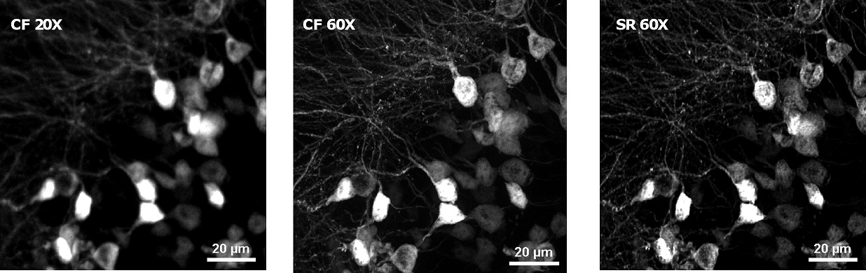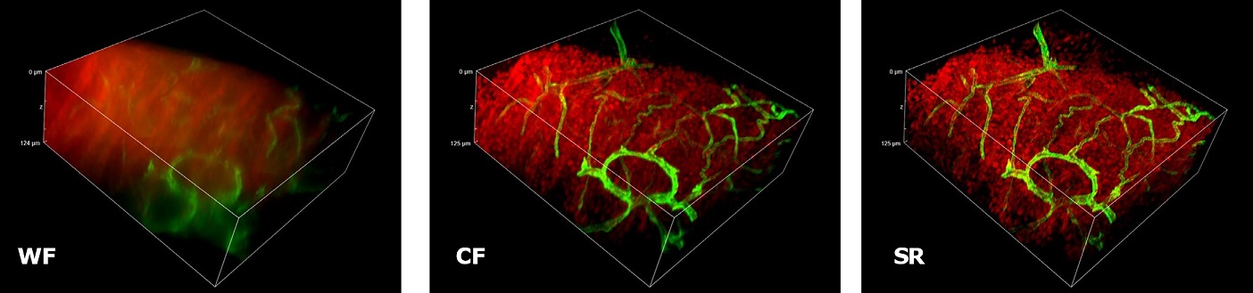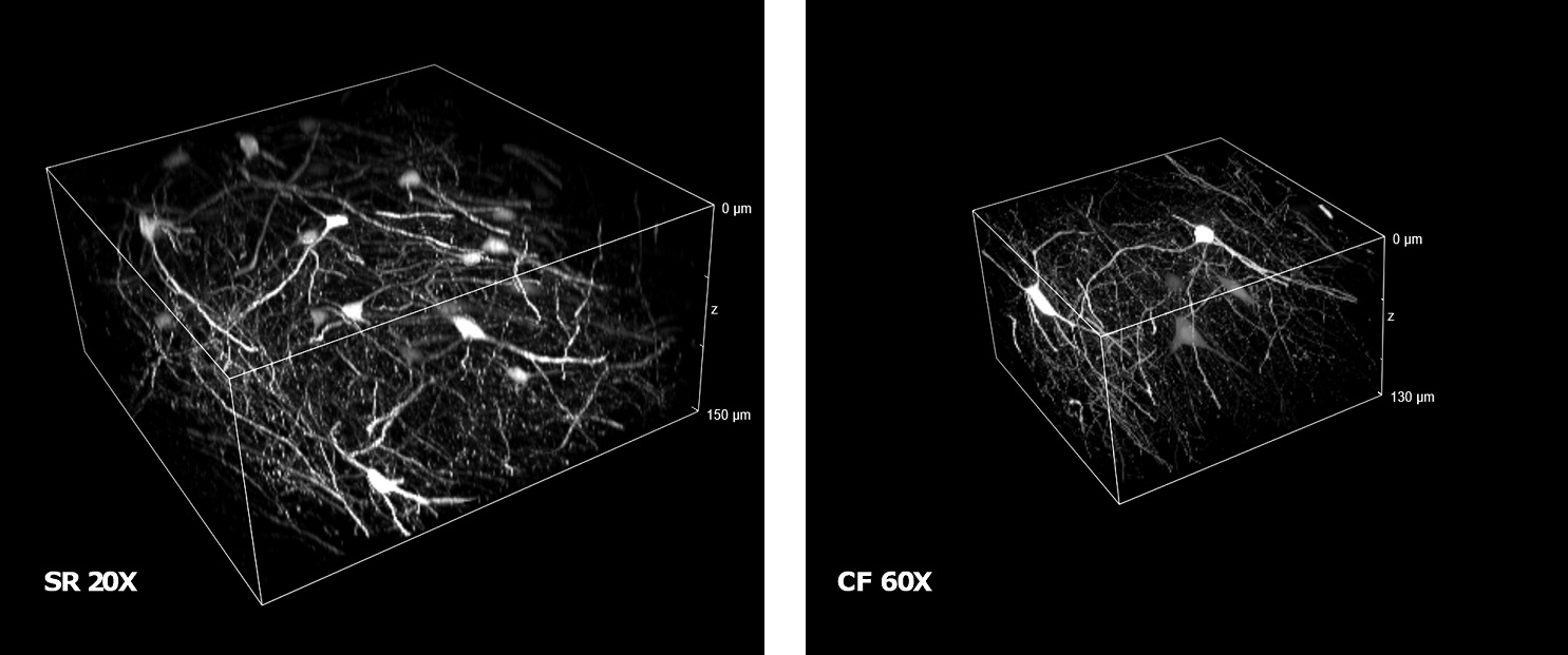 | To demonstrate the SIM Basic optimal performance also with low magnification objectives, we compared Widefield (WF), Confocal (CF), and SR images in complex and thick cleared biological samples using a CFI Plan Apo Lambda 20X air objective (NA 0.75, WD 1). In Figure 1, different visualizations of a cleared mouse intestine section (0.55 mm thickness) with blood vessels in green and nuclei in red are shown. In particular, thanks to the fast switch between three microscopy methods, we report a global comparison of WF, CF spinning disk and SR acquisitions of a volume of 125 um (Figure 1A) and a 3D movie of the SIM Basic SR acquisition showing fine details of intestinal villi (Figure 1B). In Figure 2, a cleared mouse brain section (0.55 mm thickness) with GFP-expressing neurons is shown. Notably, we acquired a 150 um Z stack of an intricate neuronal network shown as maximum intensity projection (MIP) (Figure 2A) and 3D volume view (Figure 2B). As nicely appreciated from these images, switching from WF, CF and SR modalities allows reaching an increasing resolution gain that enhances the fine details of the neuronal network even at high thickness. Moreover, we decide to compare the 20X SR acquisition with a 60X CF acquisition and, as demonstrated in figure 2C and 2D, the acquisitions with the SIM Basic not only allow to have an evident resolution improvement compared to the 20X CF acquisitions, but it enables to reach an image quality comparable to those obtained with the CF spinning disk equipped with a CFI Plan Apo Lambda 60X oil objective (NA 1.4, WD 0.13). In addition to a noticeable enhancement in neuronal details quality with respect to a 20X CF (Figure 2D), the use of the SIM Basic with 20X objective allows going even deeper into the sample than what is permitted by the maximum working distance of a common 60X oil objective (130 um) (Figure 2C).
