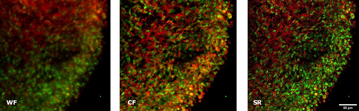 | Clearing reagents can make biological tissues transparent reducing light scattering and enhancing the visualization depth of very thick specimens in depth. However, the SIM Basic can also offer SR inside routinely prepared samples, where the different refractive index of the main biological components causes a greater scatter of light when it travels through the tissue. Therefore, we have tested some conventionally prepared samples, such as brain organoids and mouse brain sections, making acquisitions that are usually done with a confocal microscope. Human whole-brain organoids are able to recapitulate the very first neurodevelopmental events in vitro, both in terms of cellular interactions and tissue architecture, mimicking the real 3D organization of the developing human brain. In Figure 3, a human brain organoid section (50 um thickness) showing CTIP2-positive deep layer cortical neurons (green) and pan-neuronal MAP2 marker (red) is represented. In particular, we focused on a cortical plate performing a comparison between WF, CF spinning disk and SIM Basic SR images acquired with 20X air objective and shown as MIP from Z-stack (15 um). Again, switching between the three acquisition modalities, we obtained a notable increase in resolution and image quality with the SIM Basic, enhancing fine cellular structures of cortical deep-layer neurons that, differentiating towards the periphery, shape the typical laminar cortical structure. In Figure 4, we report images of another conventionally prepared sample: a hippocampal coronal slice from Thy1- GFP mouse brain (50um thickness) and, analyzing the acquisitions made with 20X air objective (Figure 4A), the resolution gain obtained with the SIM Basic is evident, also in this very scattering sample. Furthermore, focusing on neuronal details inside the intricate organization of the hippocampal neuronal network, we compared the 20X SR acquisition with a 60X CF image. As nicely reported in figure 4B, the SIM Basic equipped with the 20x air lens allows reaching an image quality comparable to those obtained with the CF spinning disk equipped with the 60X oil objective. In conclusion, all these data taken together demonstrate the capability of SIM Basic to bring out fine details in extra-large objects using routine preparation protocols. Affordable easy-to-use low magnification dry objectives can also be used to acquire both conventional and non-conventional specimens, doubling the objective performance and obtaining an image quality very similar to that reached with immersion lenses. The use of the SIM Basic with low magnification objectives allows benefiting all the advantages of an air lens, like the absence of immersion media or a greater working distance, without compromising the quality of the image. This type of configuration greatly increases the plasticity of the system and gives our customers more flexibility in applications, applying the SIM Basic as a powerful platform for SR imaging and laying the foundations for the use of SR in high-content screening. |