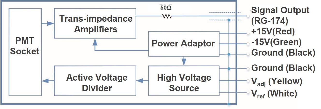 Photomultiplier Tube Accessories - High Voltage Tube Socket for Side Window, Suitable Photomultiplier Tube Side-on PMT, Input Voltage +15±1V, Input Current 80(Max)mA, Output Voltage 0~-1250V, Voltage Control Mode 0~+5V or 50KΩ Potentiometers, Reference Voltage 5.33V, The PMT Outputs A Linear Current Value 180µA(Typ) @-1000V