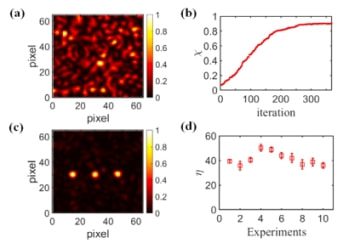 (a) Measured results of transmitted light intensity in the target area before WFS (wavefront shaping); (b) WFS feedback curves; (c) after WFS,Three focal points are built in preset positions; (d) Peak-to-background ratios (n) of the three focal points constructed in 10 different experiments.