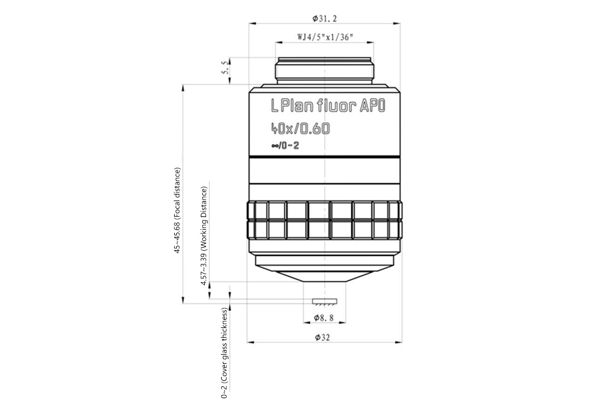 Working Distance (WD) [mm]:4.57-3.39;Numerical Aperture (NA):≥0.60;Magnification [X]:40X;Focal Length [mm]:5